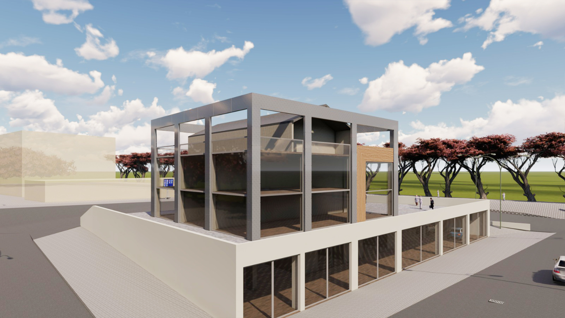 Cephe tasarımında kullanılan geniş cam yüzeyler ve güçlü çerçeve formu, iç mekanlara doğal ışık kazandırırken yapı kimliğine modern ve prestijli bir görünüm kazandırır. Açık ve yalın mimari dili sayesinde proje, hem kullanıcı deneyimini destekleyen hem de şehir dokusuna uyum sağlayan dengeli bir ticari yapı karakteri oluşturur.